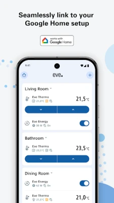 This version of the Eve app for Android supports Eve Light Switch, Eve Shutter Switch, Eve Thermo (4th gen. and newer), and Eve Energy connected through the Google Home platform. Please note that Eve Energy Outdoor and Eve Energy Outlet are not yet supported in this release. Support for additional Eve devices and platforms will be added in future versions of the app, so stay tuned!