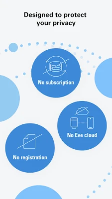 Just like your Eve devices, the Eve app is designed from the ground up to protect your privacy. That means: no registration, no additional accounts, and no subscriptions. All data is only transferred directly between your Eve device and this app and is never stored or processed in any cloud.